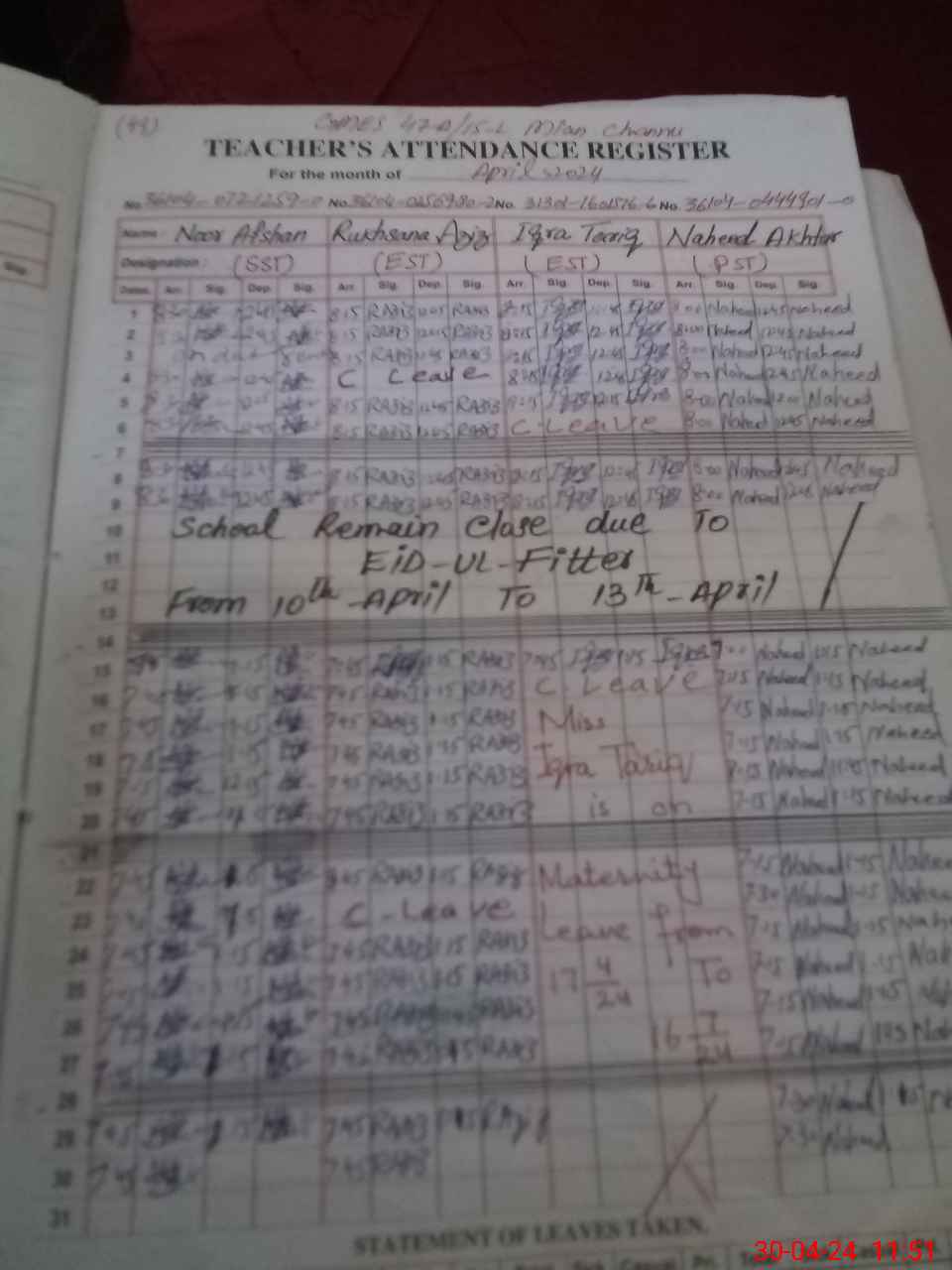 | 31**** | Iq**** Ta**** | Regular | 24 | 0 | 0 | 24 | 0 | 0 | 0 | 0 | 0 | Maternity | |