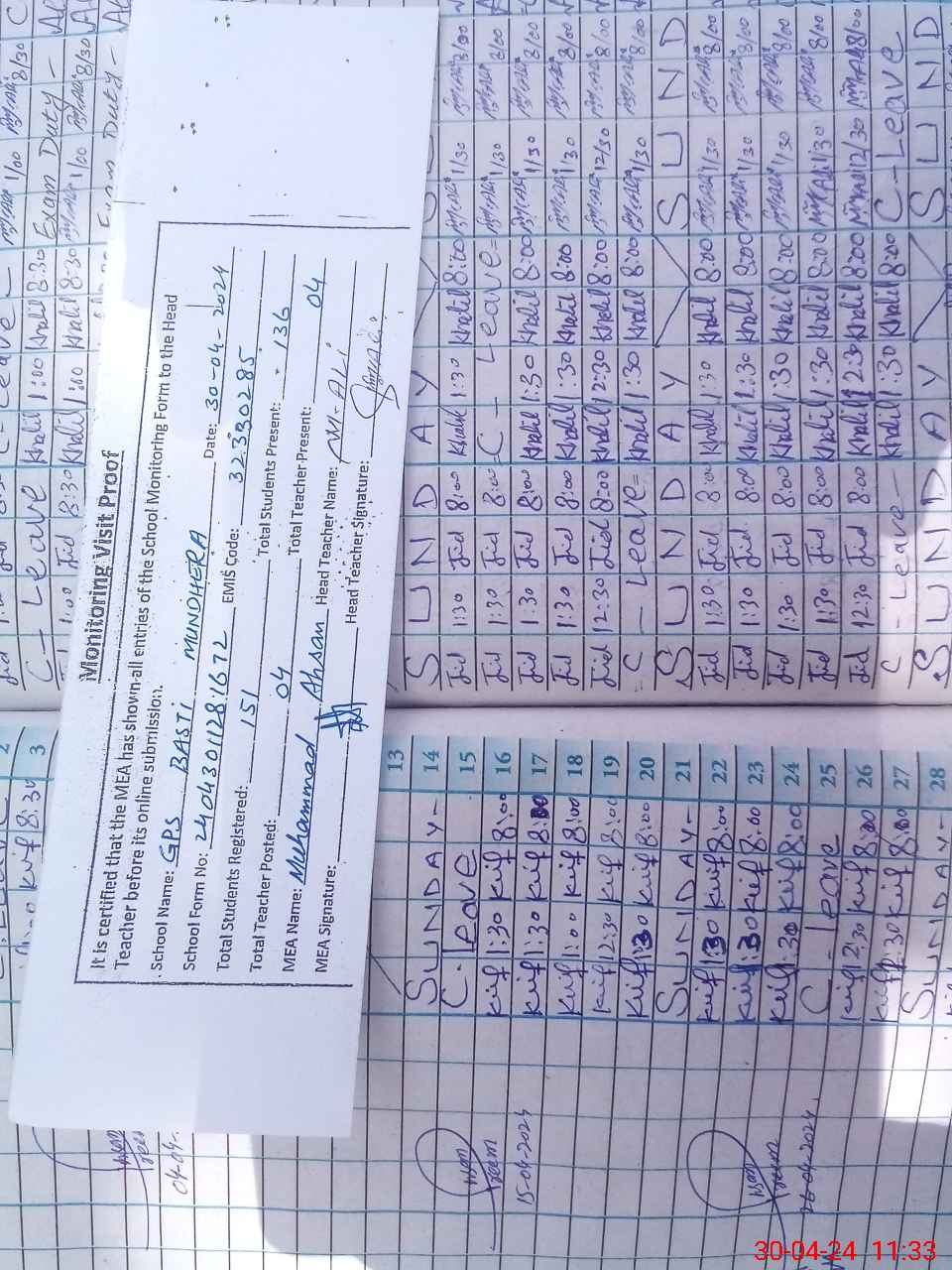 | Attendance Register | Head Teacher | MEA with School | Visit Proof |