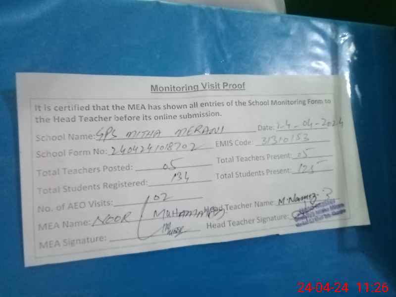 | EMIS Code: 31310153 | Name of School: GPS MITHA MERANI (After Noon) | |||