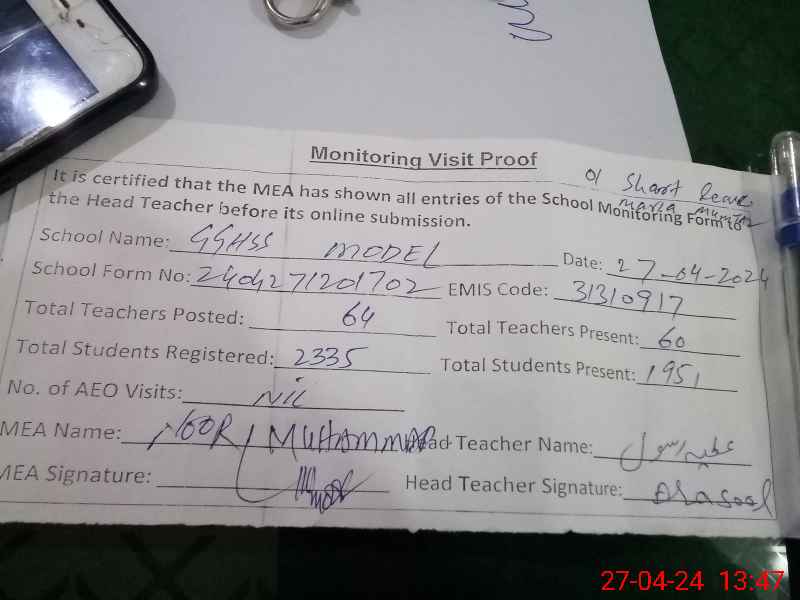 | Certified that this School was Inspected by the Undersigned MEA/DMO Today and the Information Stated Above is as Per Record. | |||||
