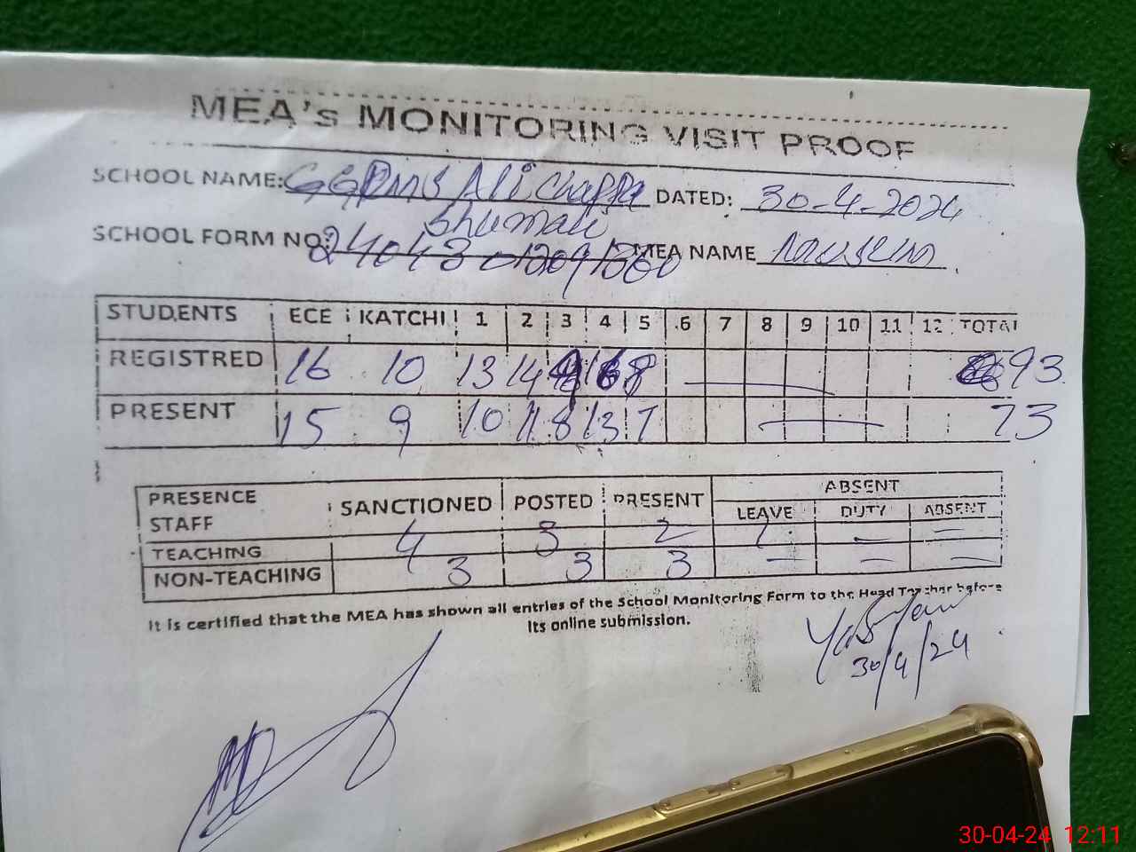 | Attendance Register | Head Teacher | MEA with School | Visit Proof |
