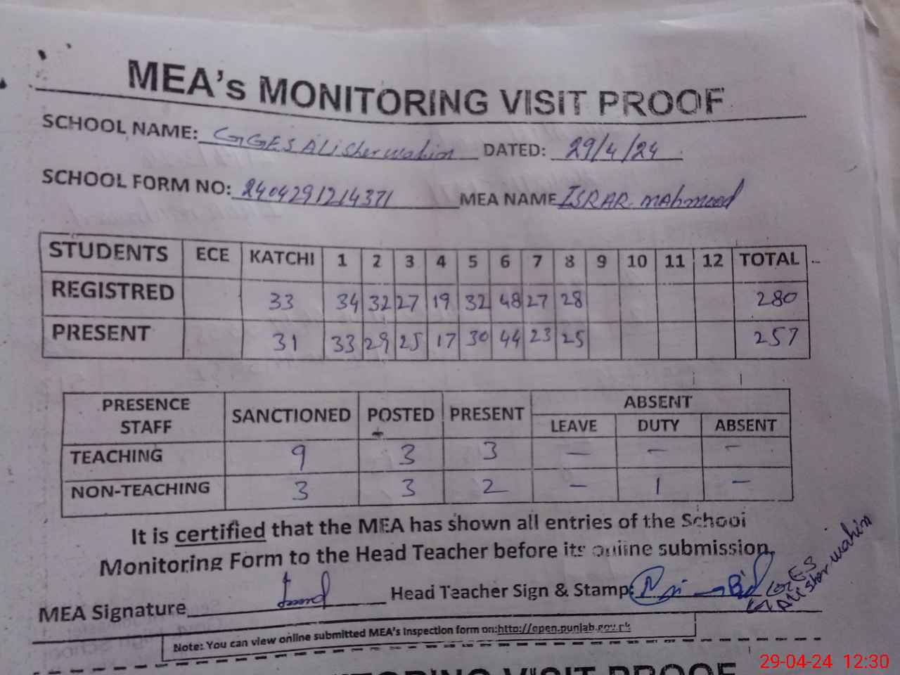 | Attendance Register | Head Teacher | MEA with School | Visit Proof |