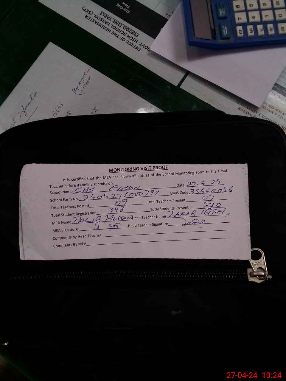 | Attendance Register | Head Teacher | MEA with School | Visit Proof |