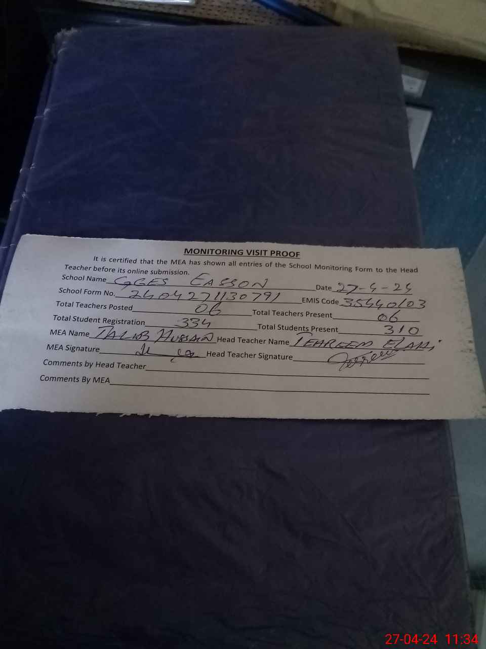 | Attendance Register | Head Teacher | MEA with School | Visit Proof |