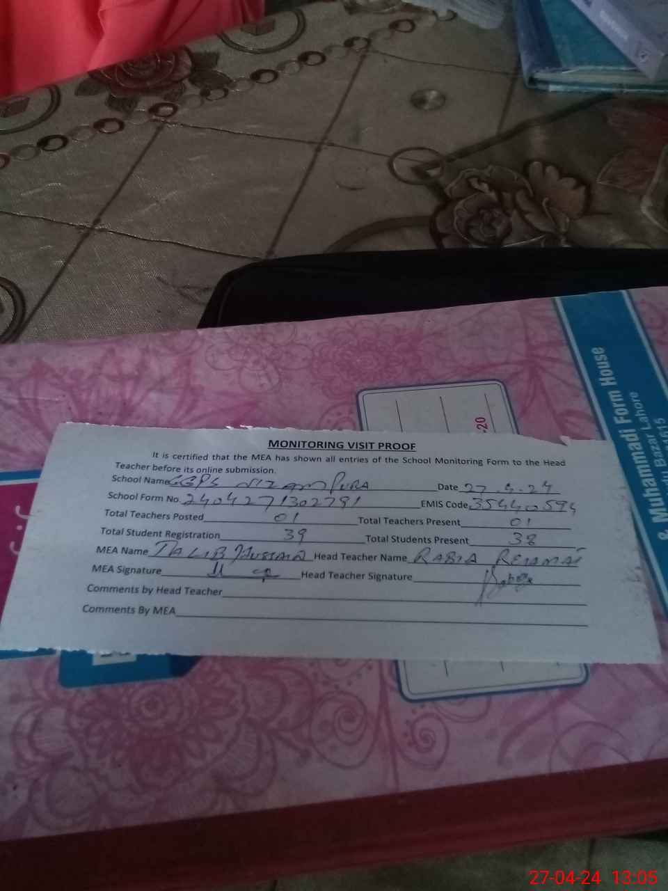 | Attendance Register | Head Teacher | MEA with School | Visit Proof |