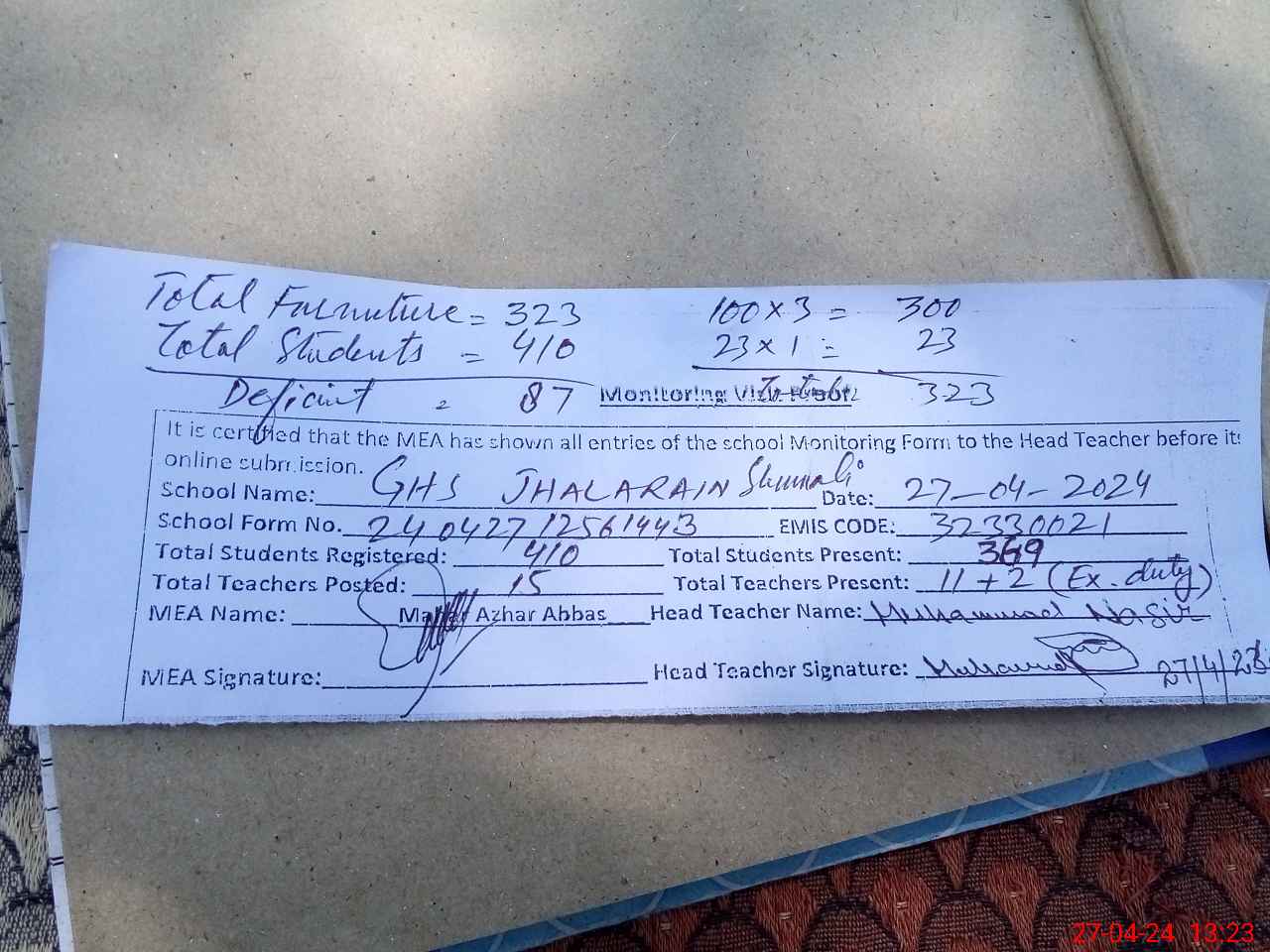 | EMIS Code: 32330021 | Name of School: GHS JHALRAIN SHUMALI | |||