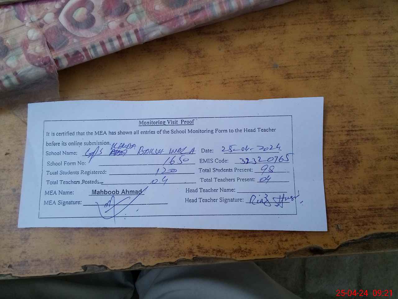 | Attendance Register | Head Teacher | MEA with School | Visit Proof |