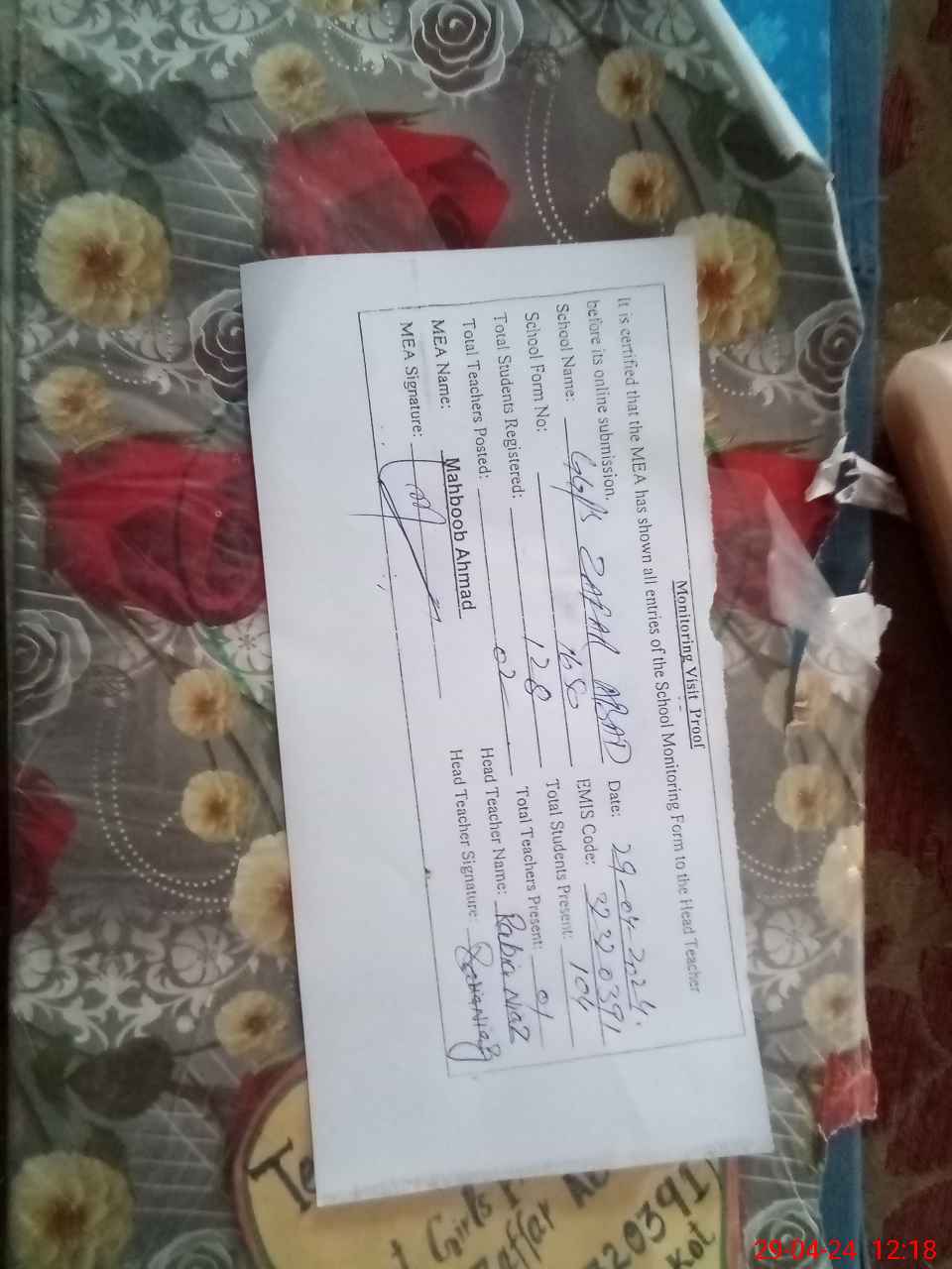 | Attendance Register | Head Teacher | MEA with School | Visit Proof |
