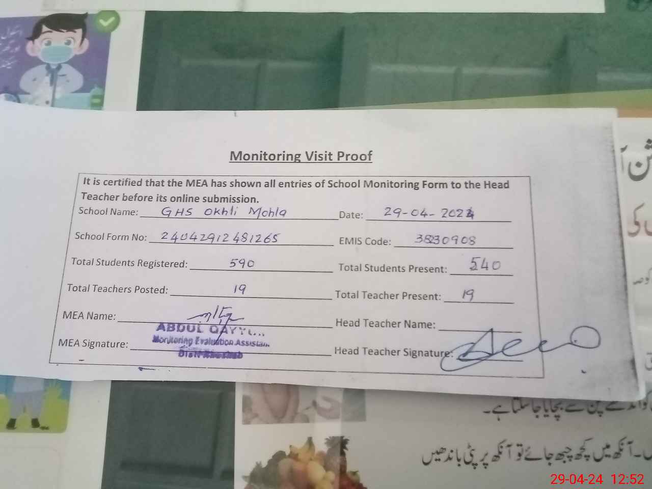 | EMIS Code: 38230908 | Name of School: GHS OKHLI MOHLA | |||
