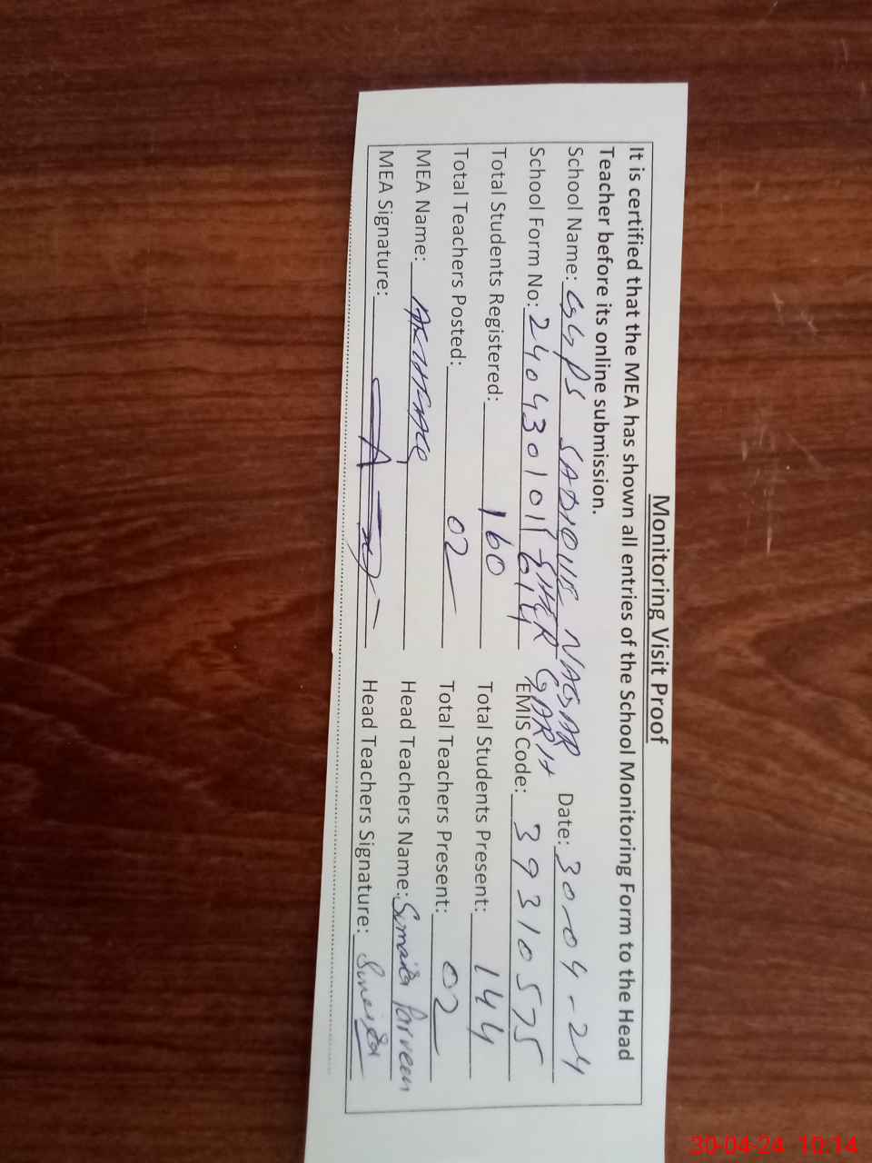 | Attendance Register | Head Teacher | MEA with School | Visit Proof |