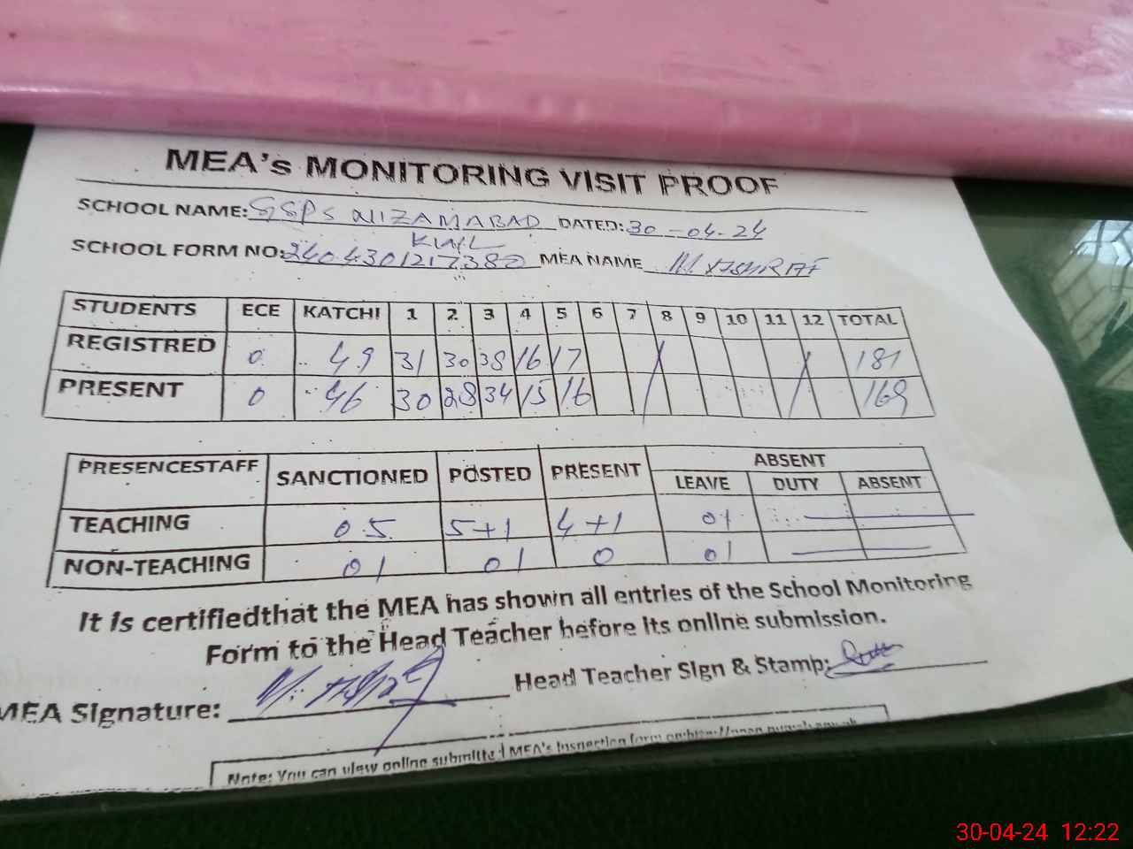 | Attendance Register | Head Teacher | MEA with School | Visit Proof |