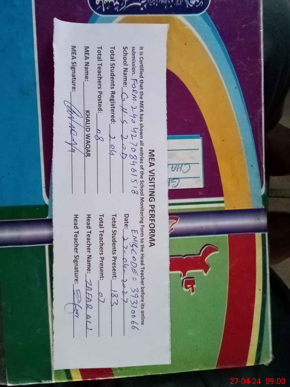 | Attendance Register | Head Teacher | MEA with School | Visit Proof |