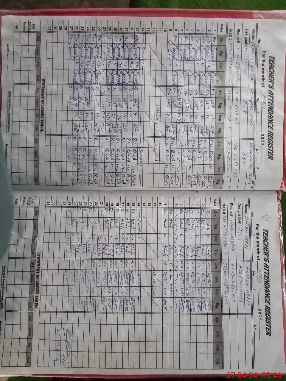 | CNIC | Full Name | Designation | R/C | Absence During Last Calender Month |