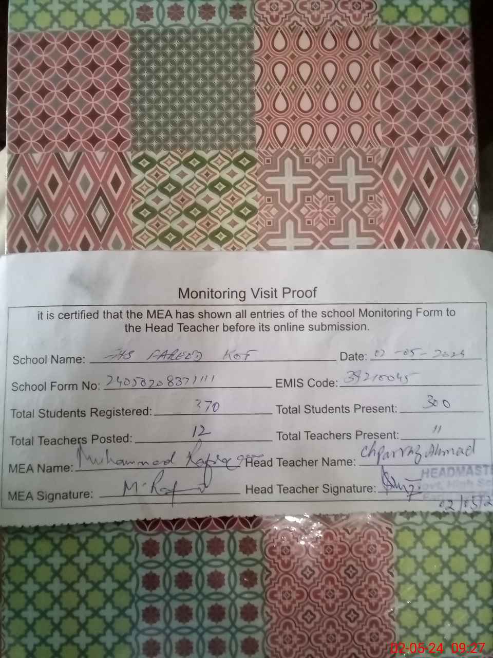 | Attendance Register | Head Teacher | MEA with School | Visit Proof |