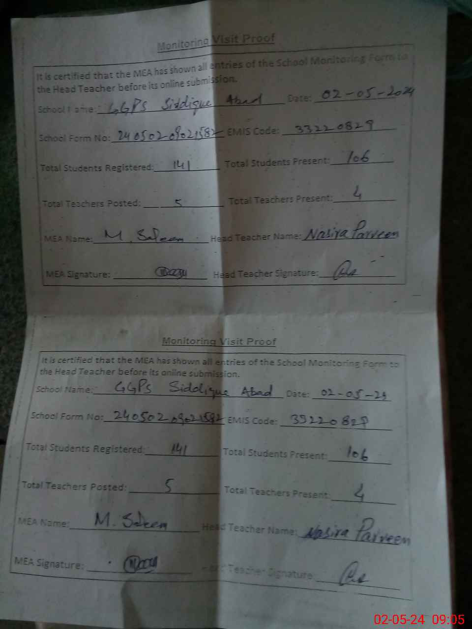 | Attendance Register | Head Teacher | MEA with School | Visit Proof |