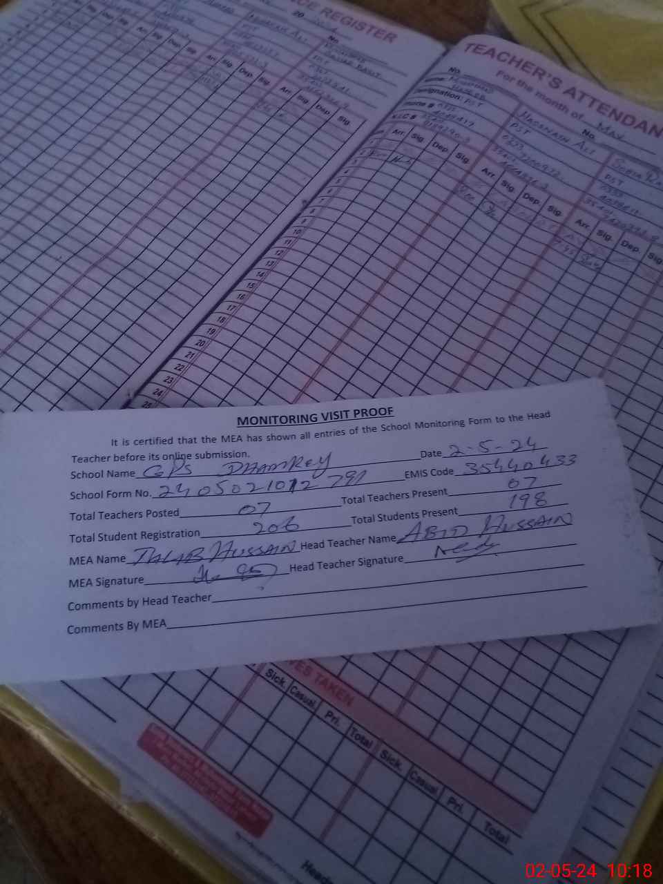 | Attendance Register | Head Teacher | MEA with School | Visit Proof |