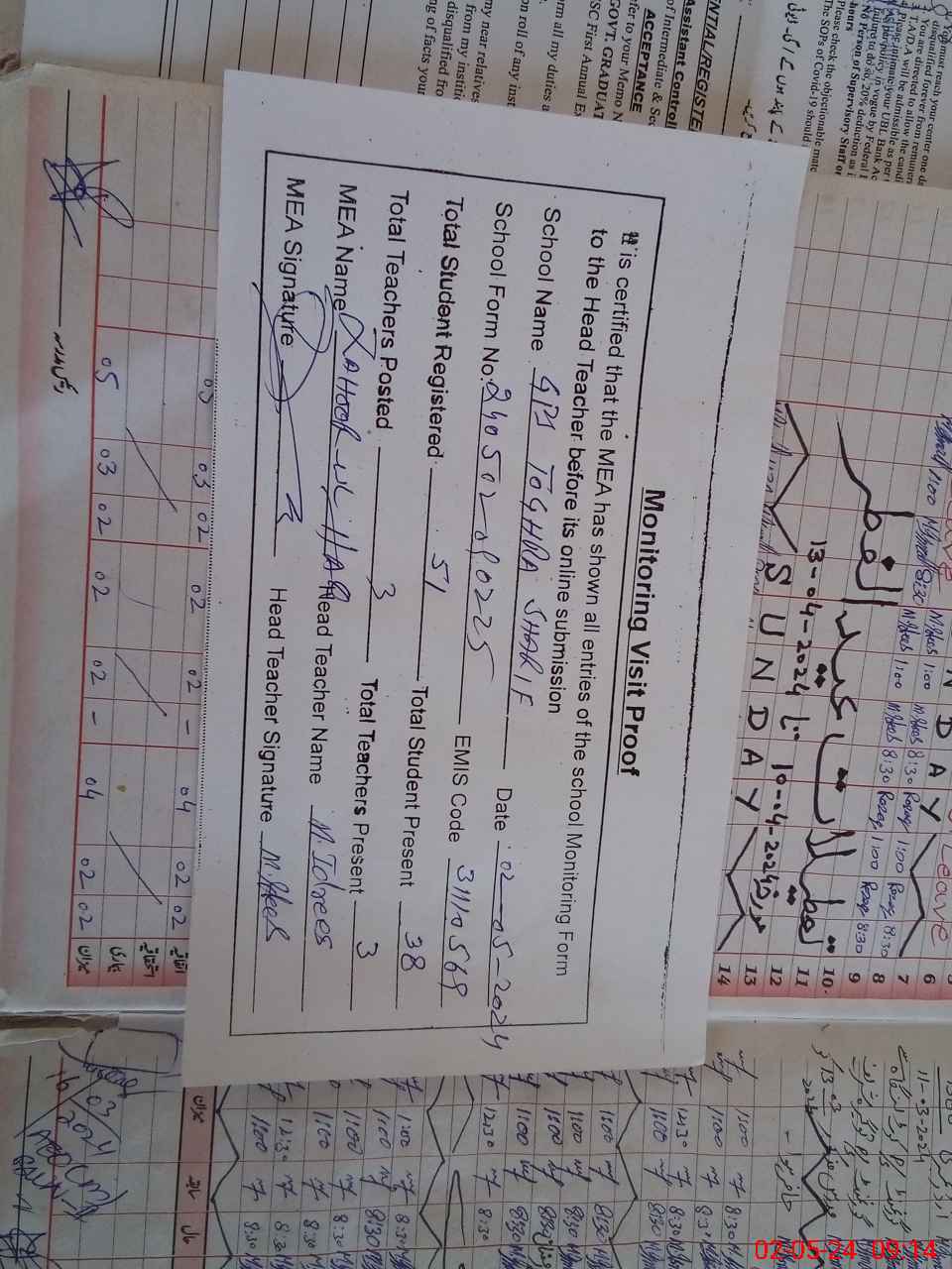 | Attendance Register | Head Teacher | MEA with School | Visit Proof |