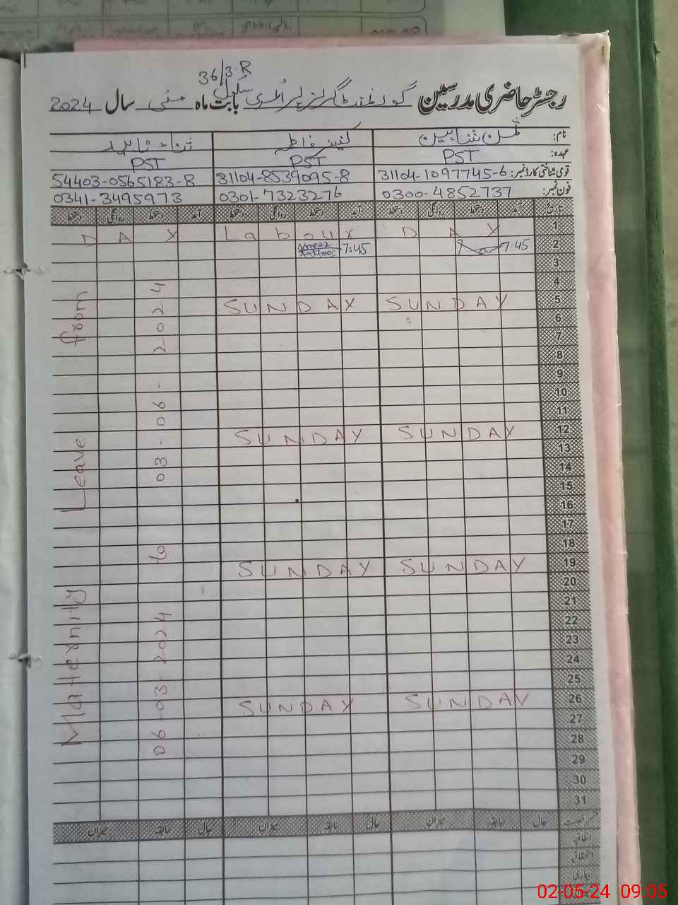 | 54**** | Sa**** Na**** | PST | Regular | 30 | 0 | 0 | 30 | 0 | 0 | 0 | 0 | 0 | Maternity |