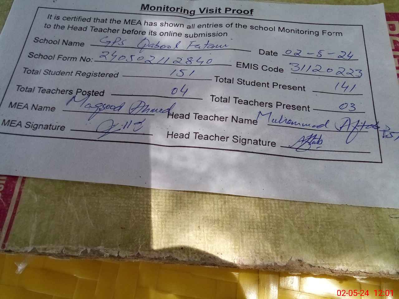 | Attendance Register | Head Teacher | MEA with School | Visit Proof |