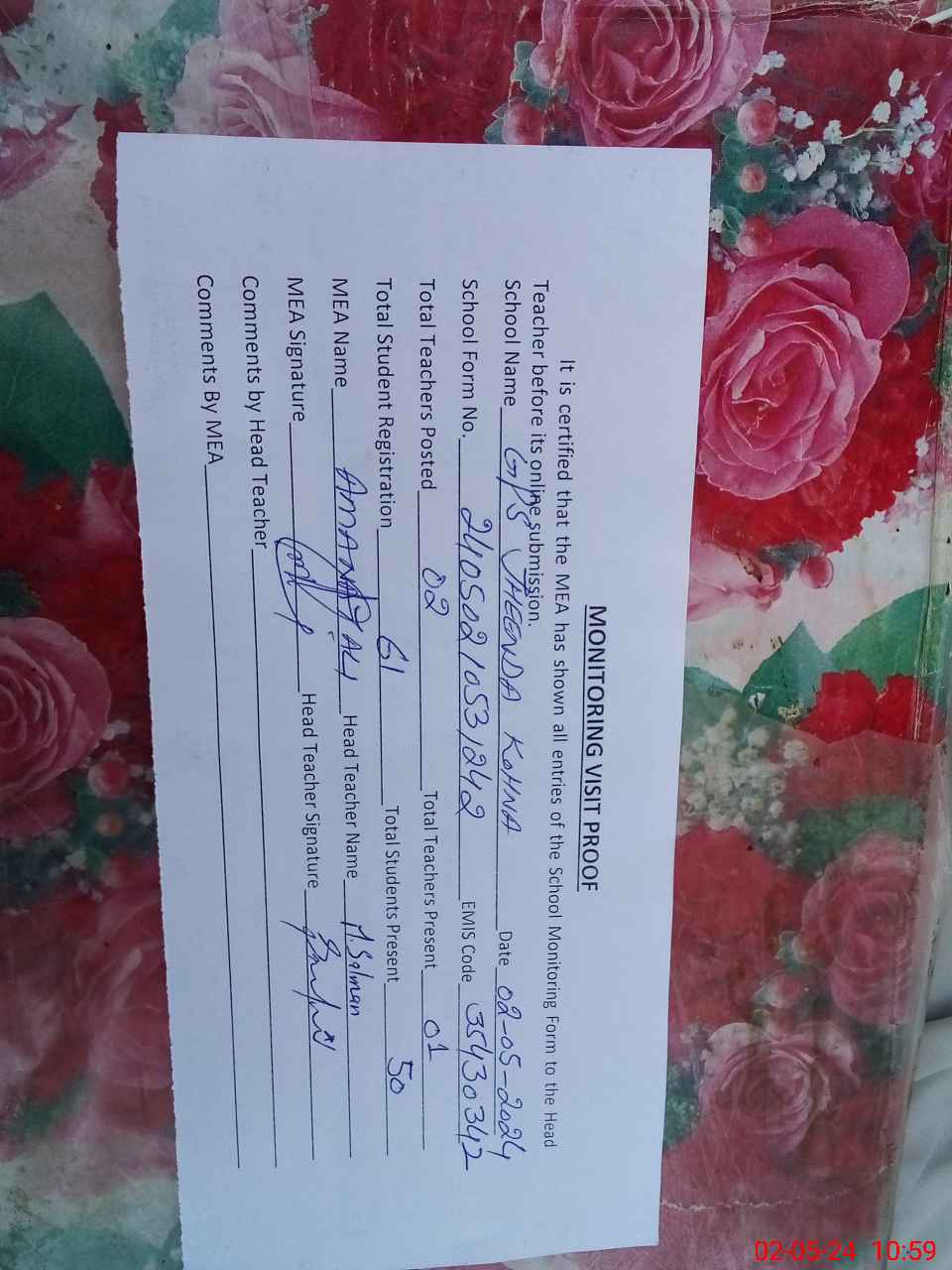 | Attendance Register | Head Teacher | MEA with School | Visit Proof |