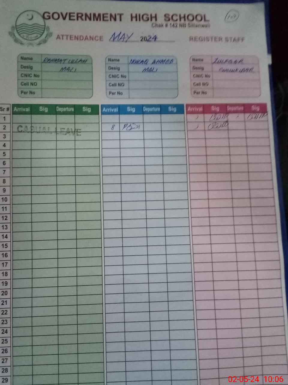 | CNIC | Full Name | Designation | R/C | Absence during last cal. month |
