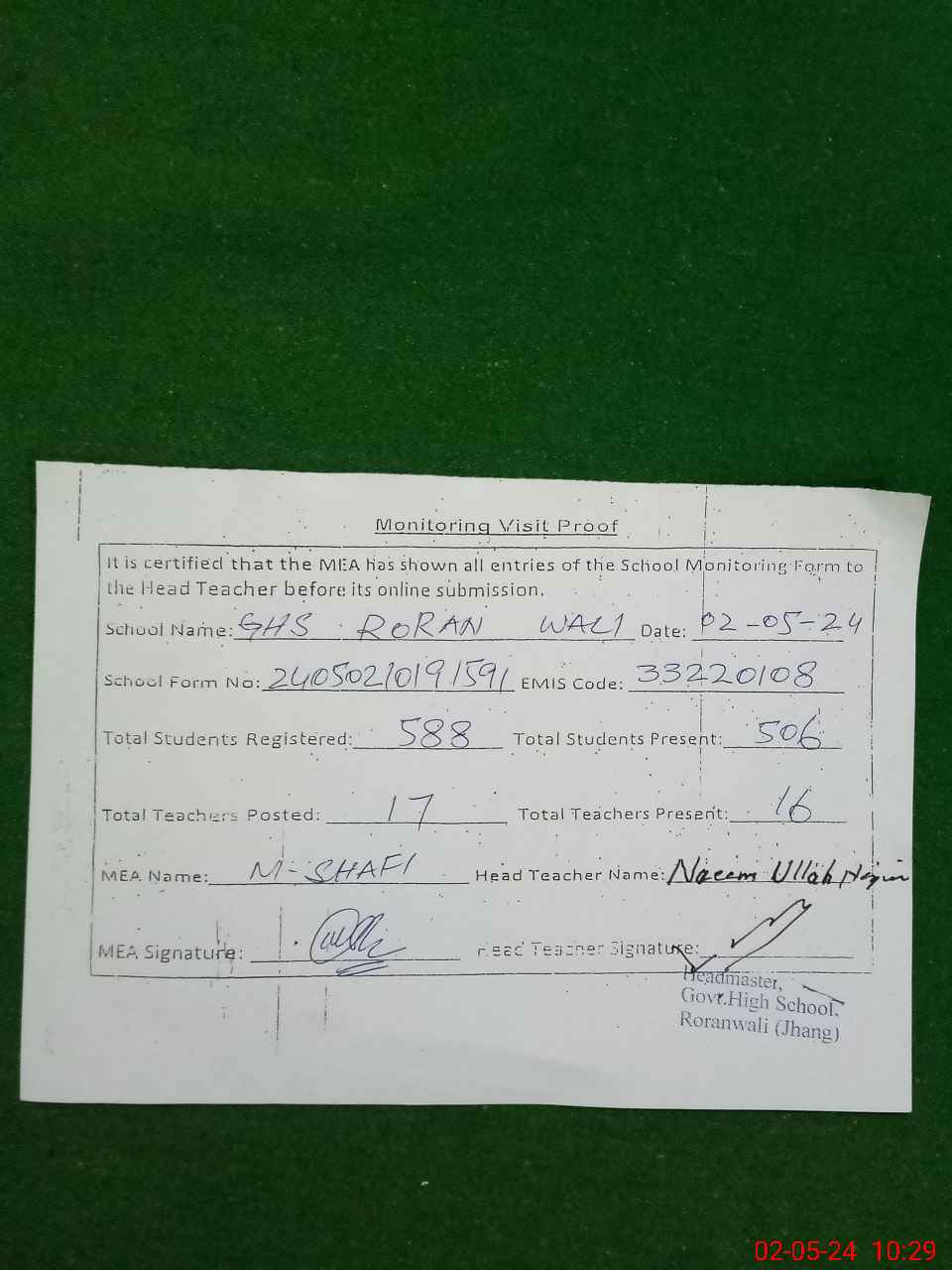 | EMIS Code: 33220108 | Name of School: GHS RORAN WALI | |||