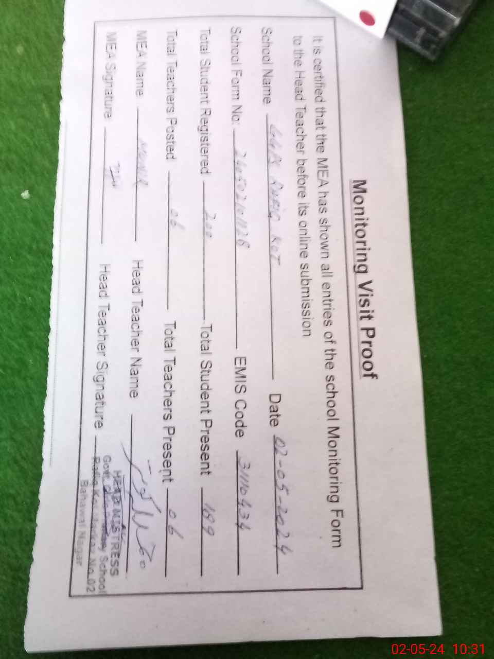 | Attendance Register | Head Teacher | MEA with School | Visit Proof |