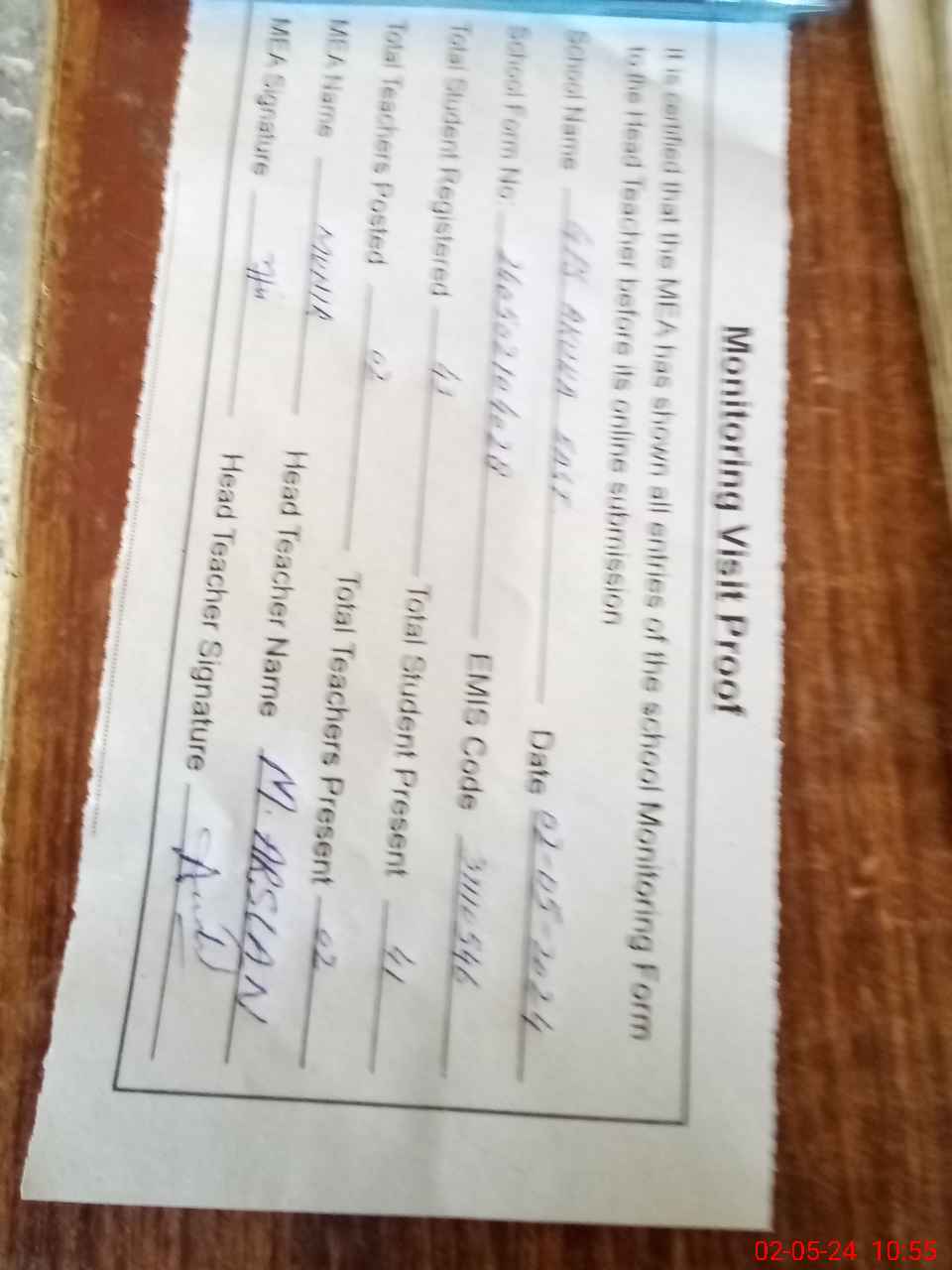 | Certified that this School was Inspected by the Undersigned MEA/DMO Today and the Information Stated Above is as Per Record. | |||||