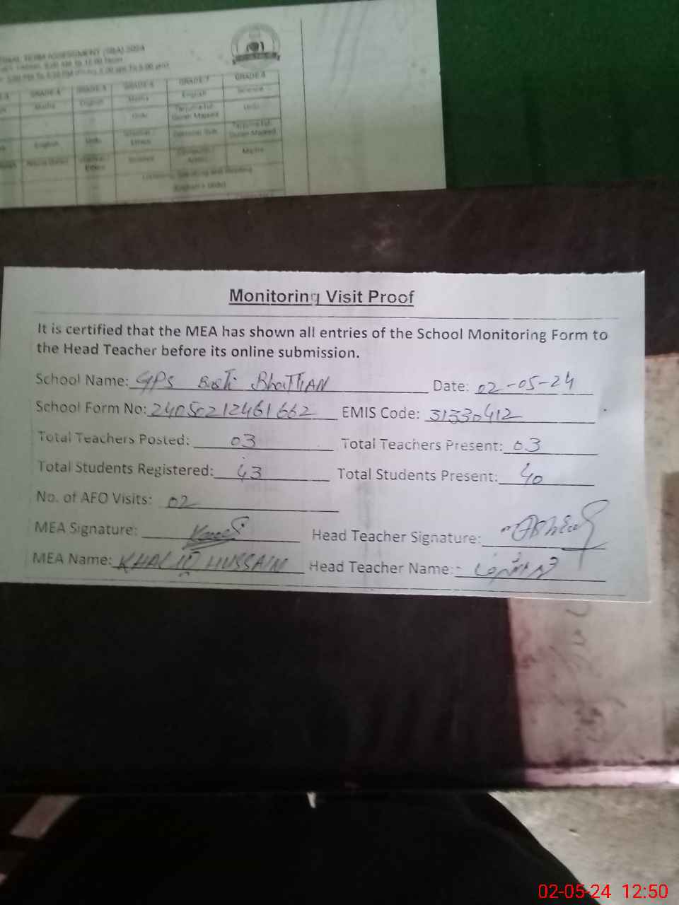 | Certified that this School was Inspected by the Undersigned MEA/DMO Today and the Information Stated Above is as Per Record. | |||||