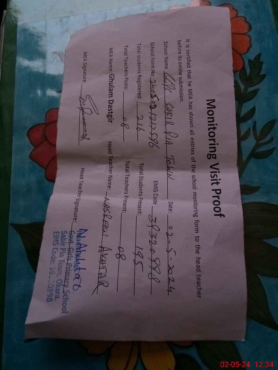 | EMIS Code: 39320998 | Name of School: GGPS SABIR PIA TOWN OKARA | |||