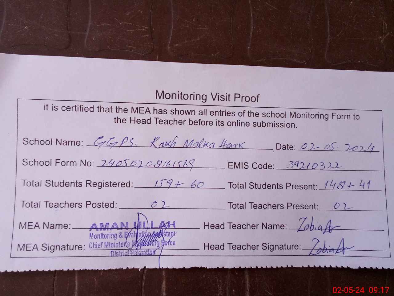 | Attendance Register | Head Teacher | MEA with School | Visit Proof |