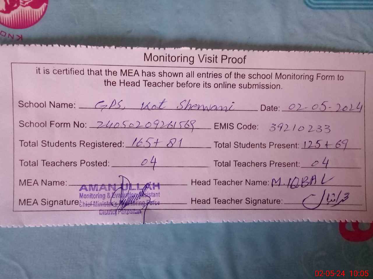 | Attendance Register | Head Teacher | MEA with School | Visit Proof |