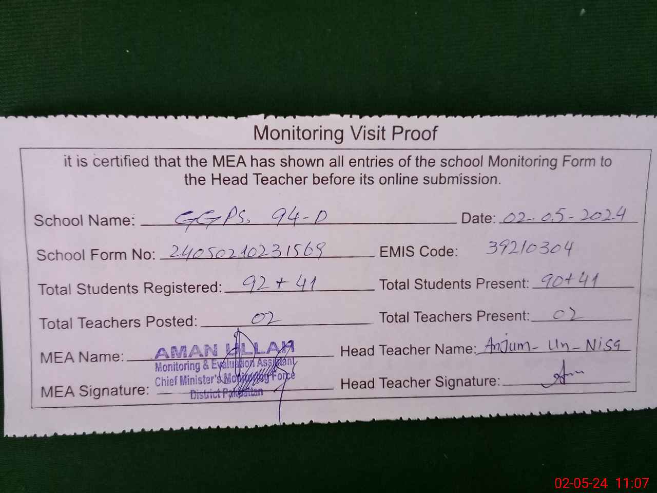 | EMIS Code: 39210304 | Name of School: GGPS 94 D | |||