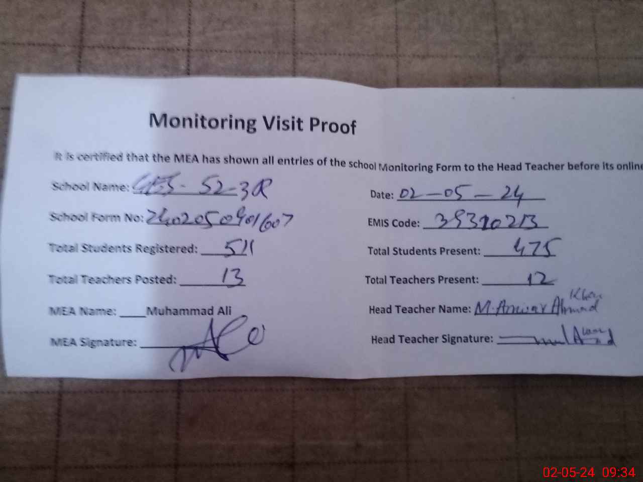| Certified that this School was Inspected by the Undersigned MEA/DMO Today and the Information Stated Above is as Per Record. | |||||