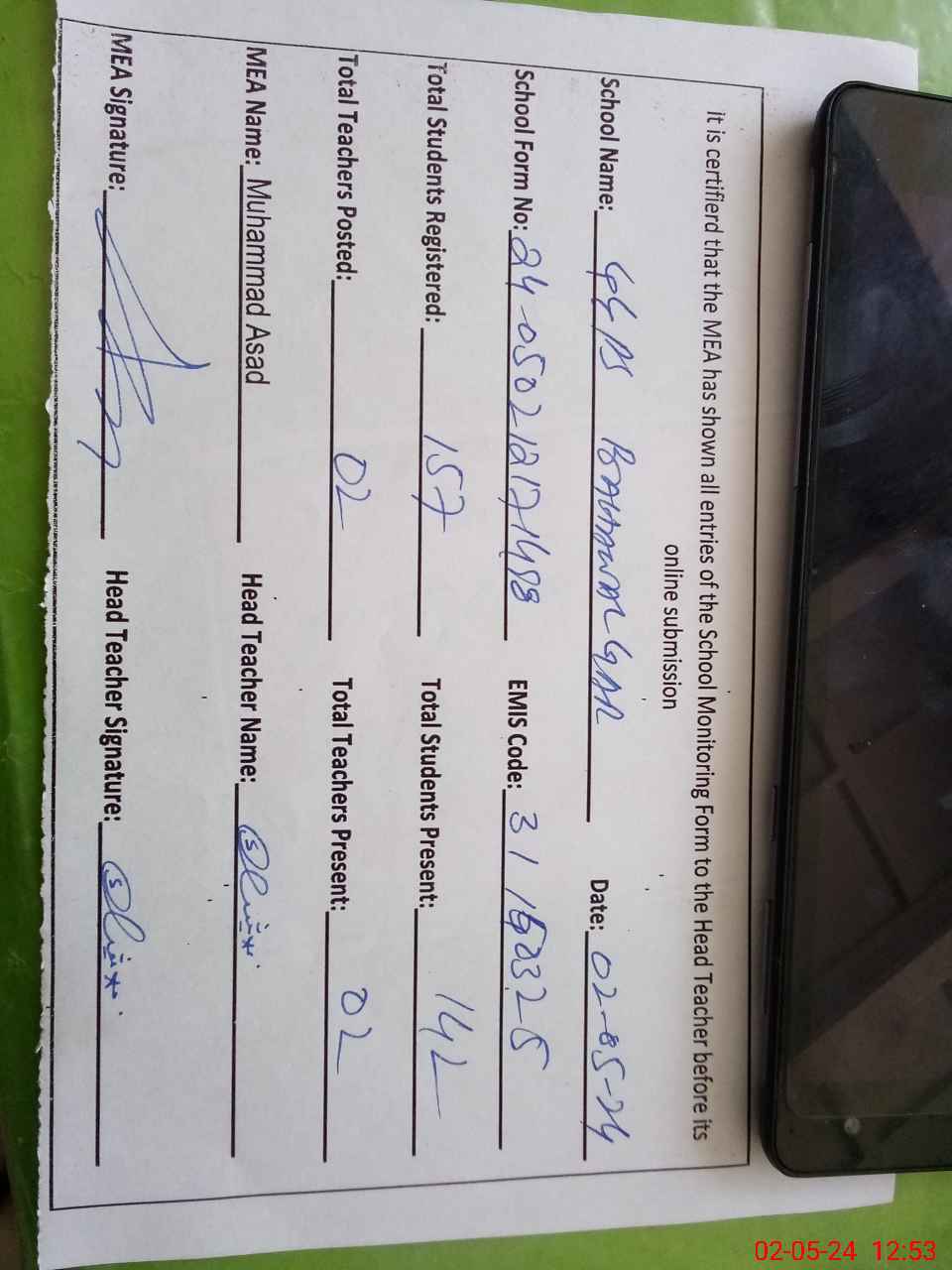 | Attendance Register | Head Teacher | MEA with School | Visit Proof |