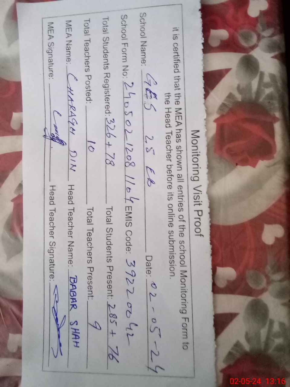 | Attendance Register | Head Teacher | MEA with School | Visit Proof |