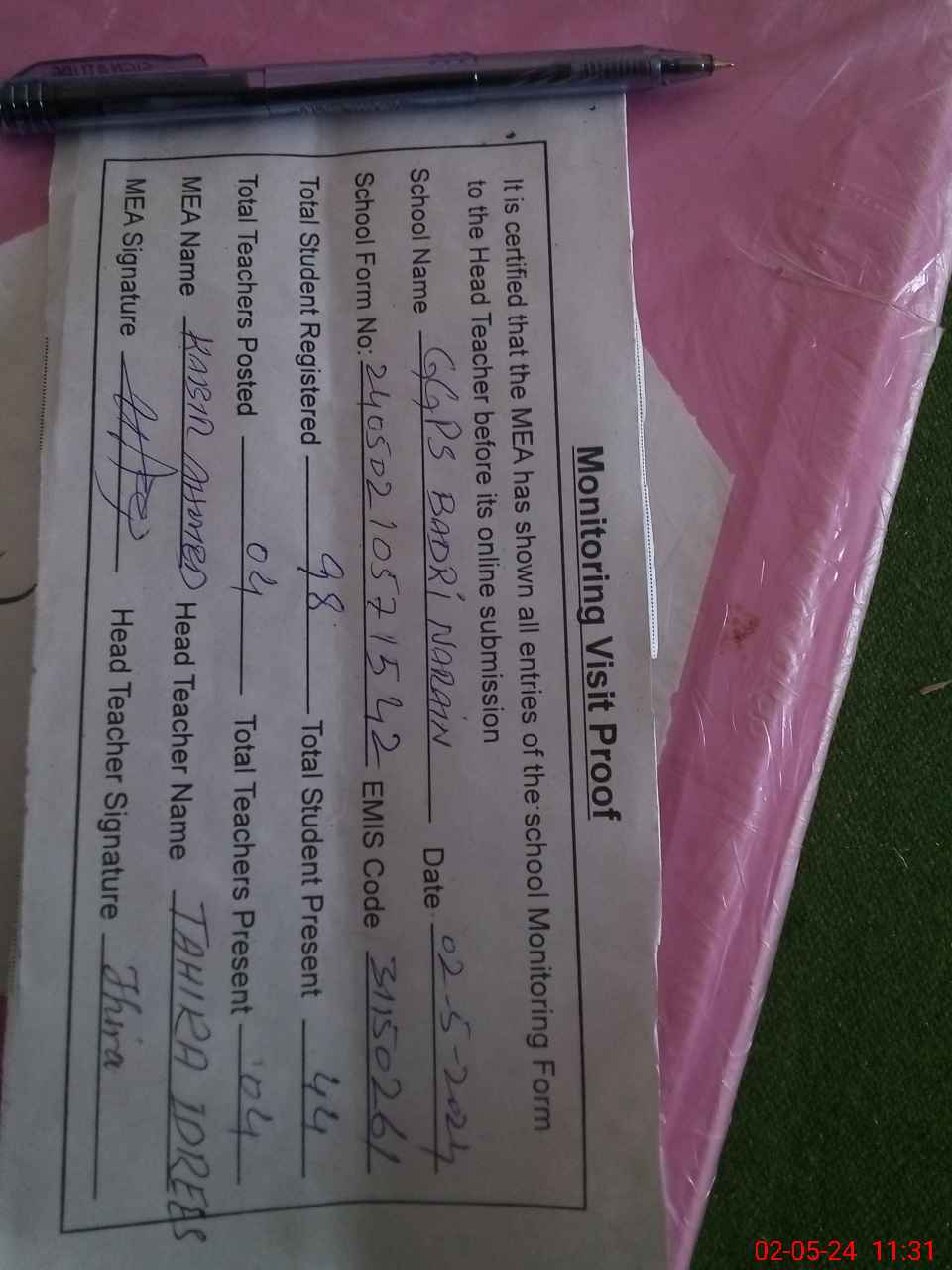 | Attendance Register | Head Teacher | MEA with School | Visit Proof |