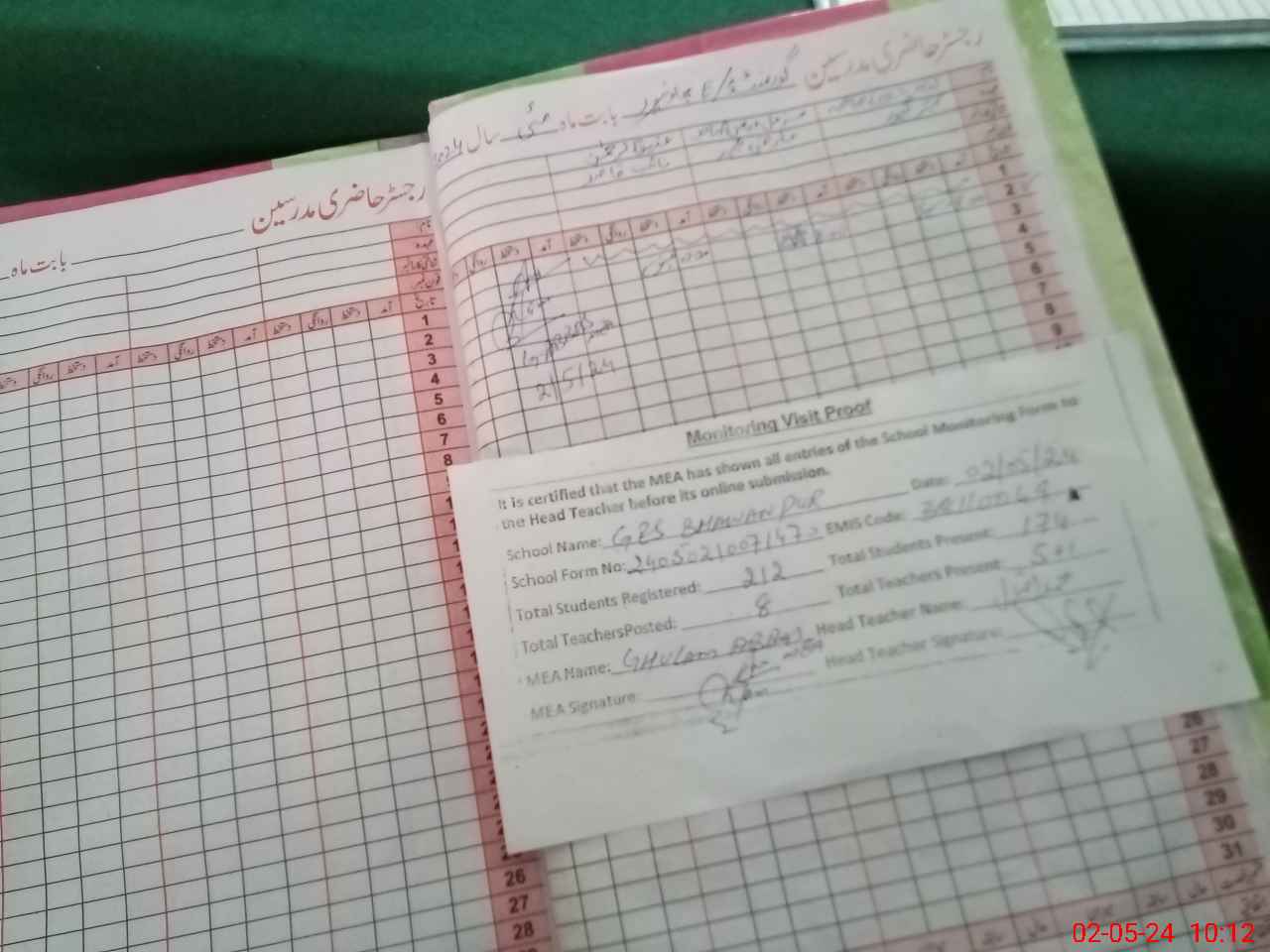 | Attendance Register | Head Teacher | MEA with School | Visit Proof |