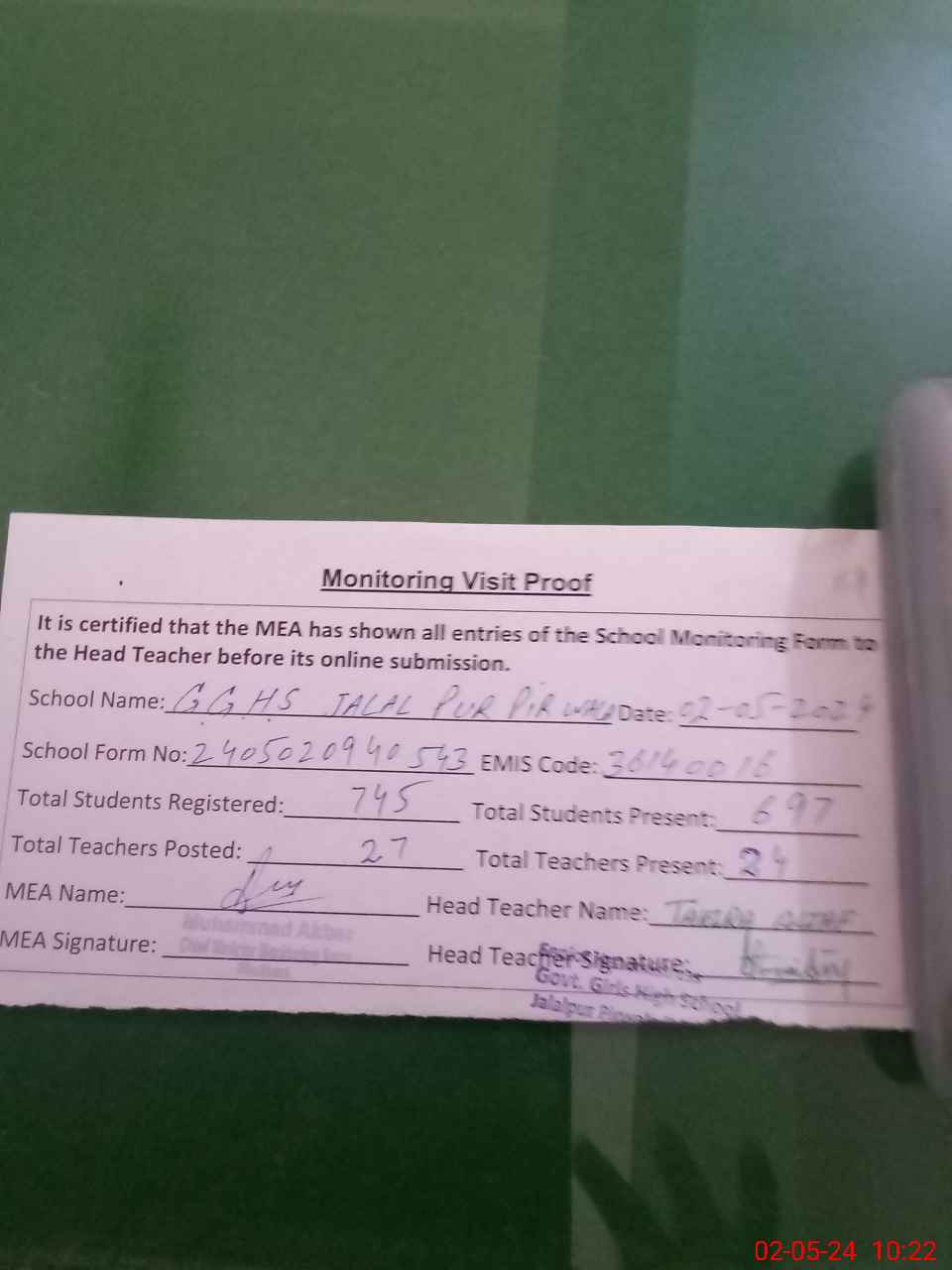 | Attendance Register | Head Teacher | MEA with School | Visit Proof |