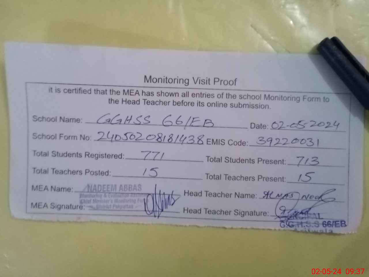 | Attendance Register | Head Teacher | MEA with School | Visit Proof |