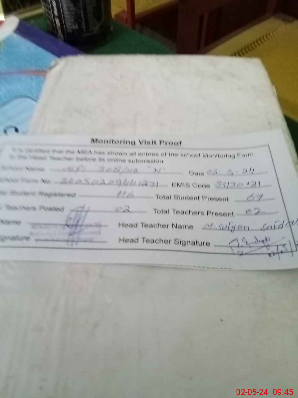 | Attendance Register | Head Teacher | MEA with School | Visit Proof |