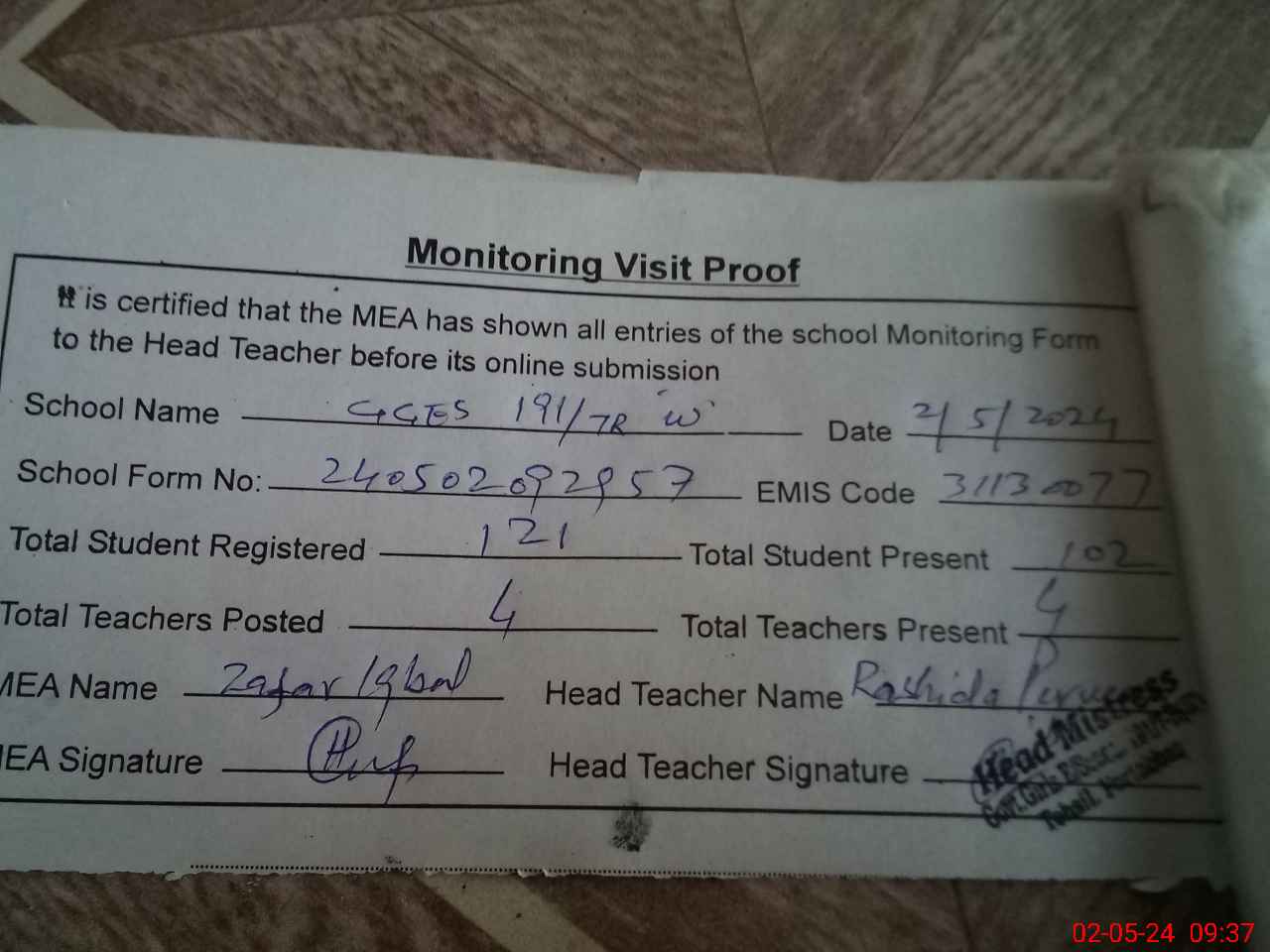 | EMIS Code: 31130077 | Name of School: GGES CHAK NO 191/7-R | |||