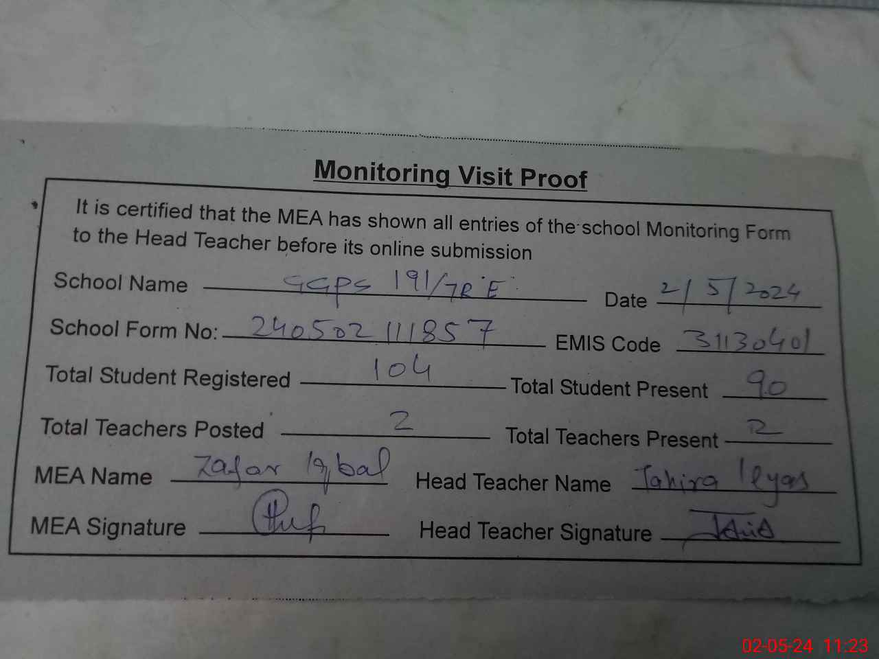 | Attendance Register | Head Teacher | MEA with School | Visit Proof |