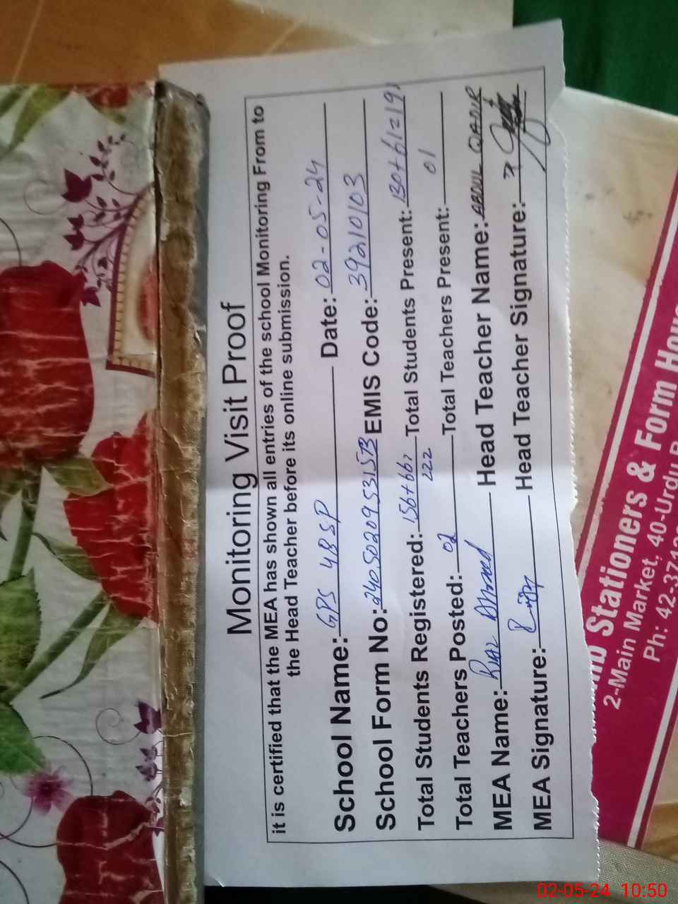 | Attendance Register | Head Teacher | MEA with School | Visit Proof |