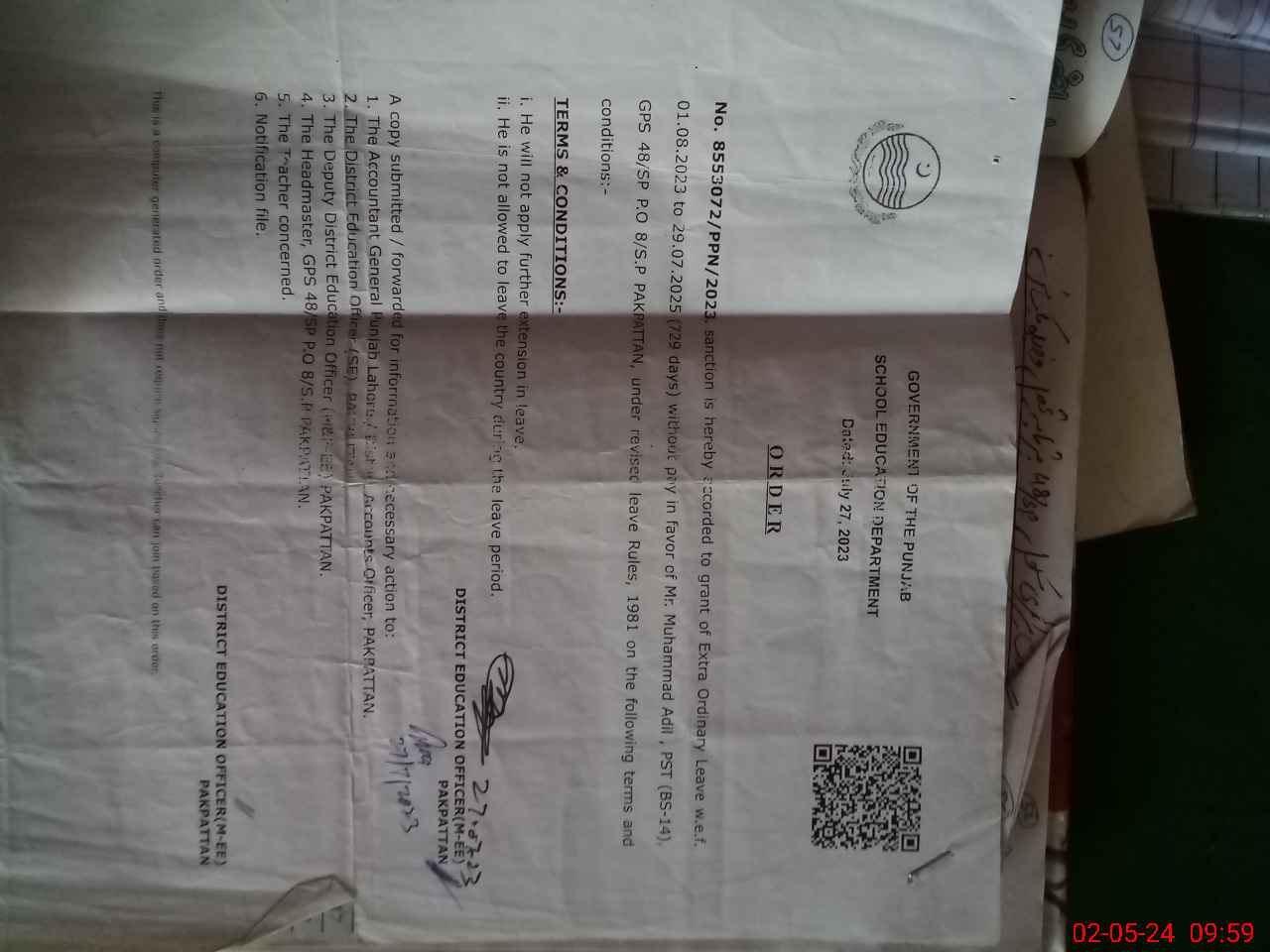 | Name: AB**** QA**** Designation: (School Headmaster's/Headmistress's) PST Phone/Cell Number: 03**** |