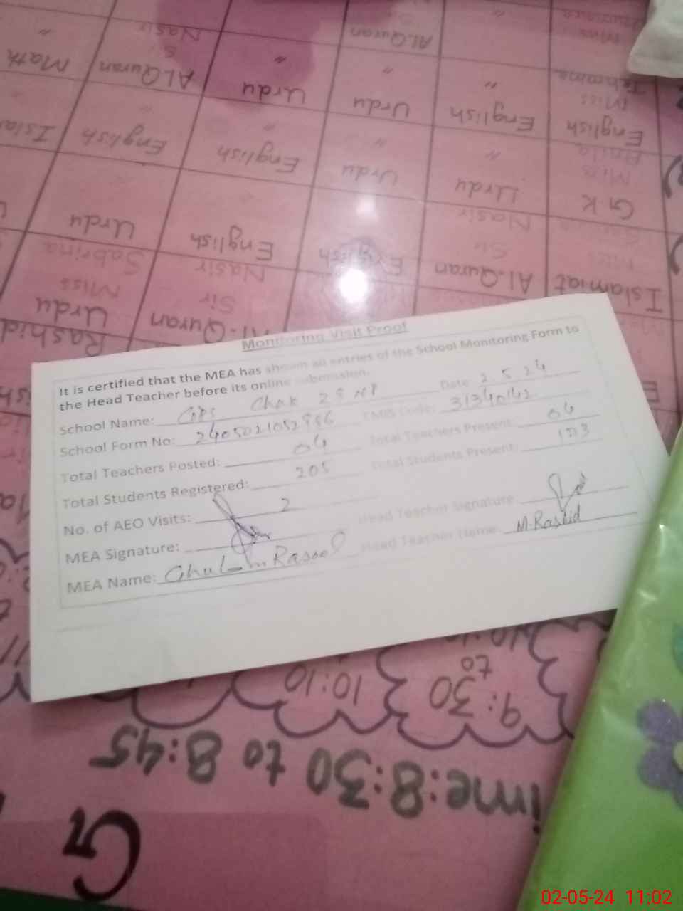 | Attendance Register | Head Teacher | MEA with School | Visit Proof |