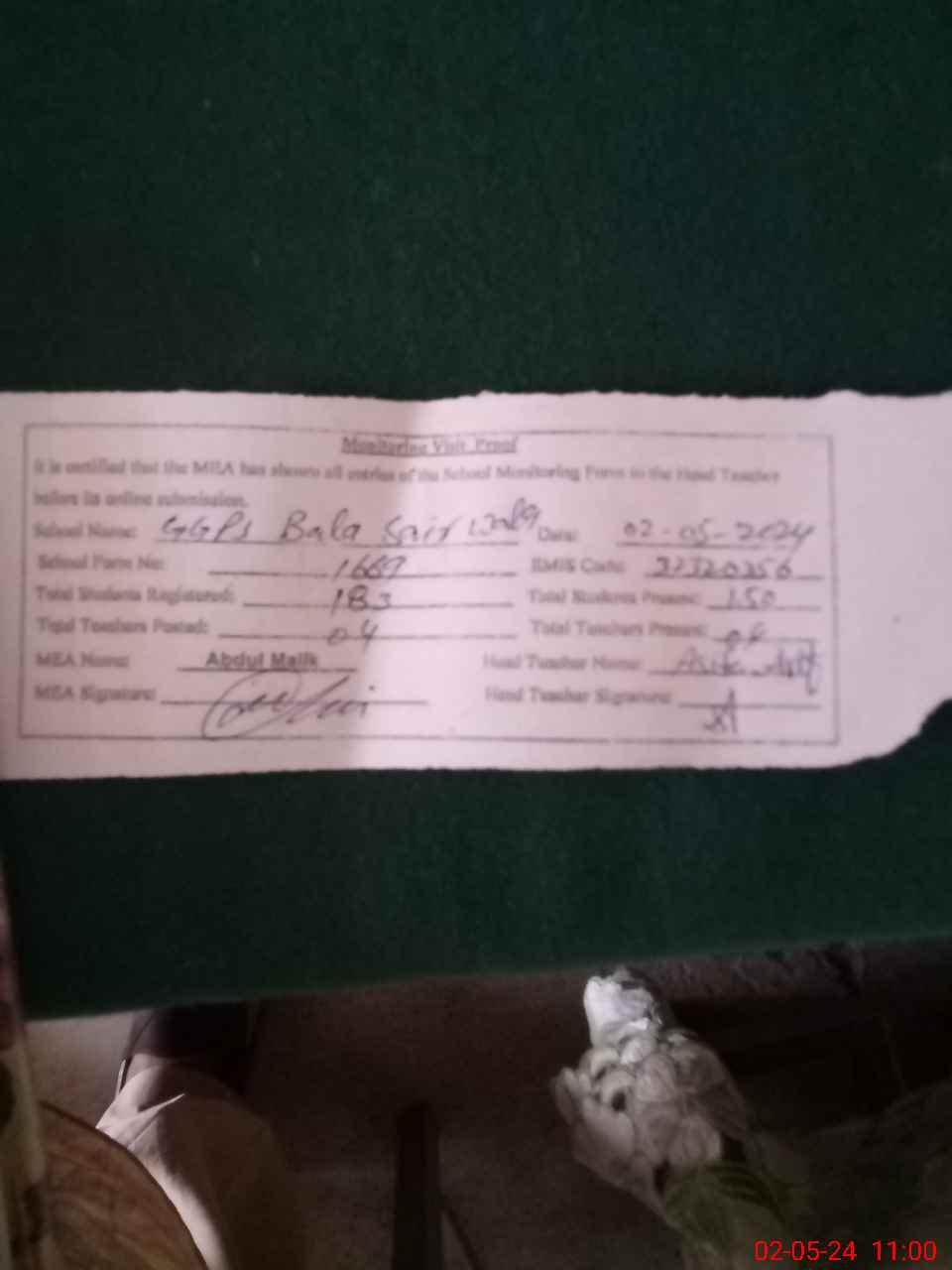| Attendance Register | Head Teacher | MEA with School | Visit Proof |