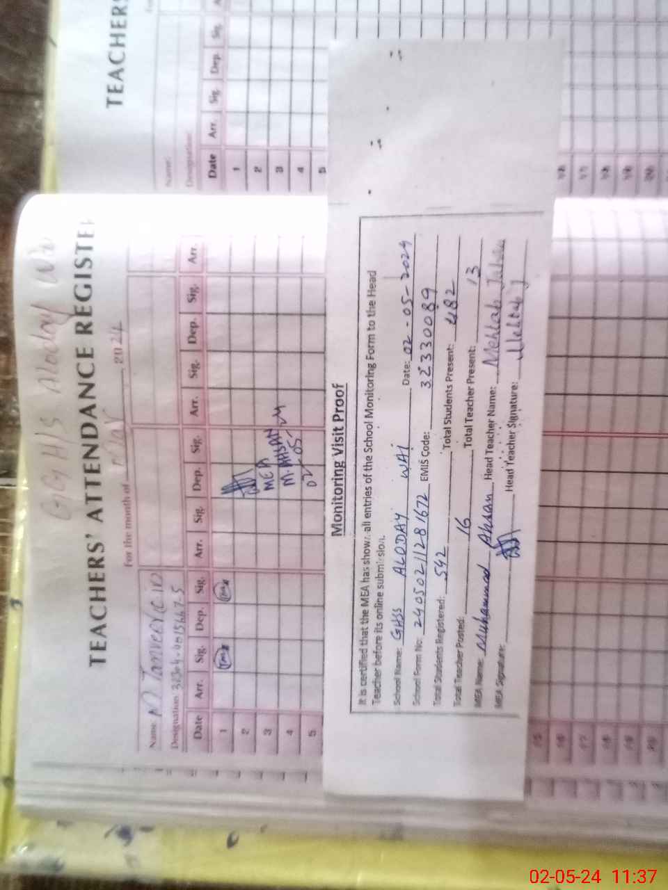 | EMIS Code: 32330089 | Name of School: GGHS ALODAY WALI | |||