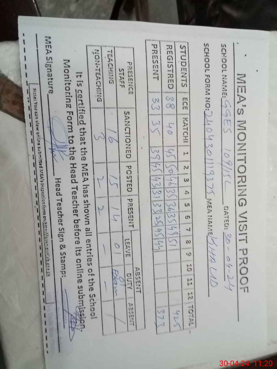 | Attendance Register | Head Teacher | MEA with School | Visit Proof |