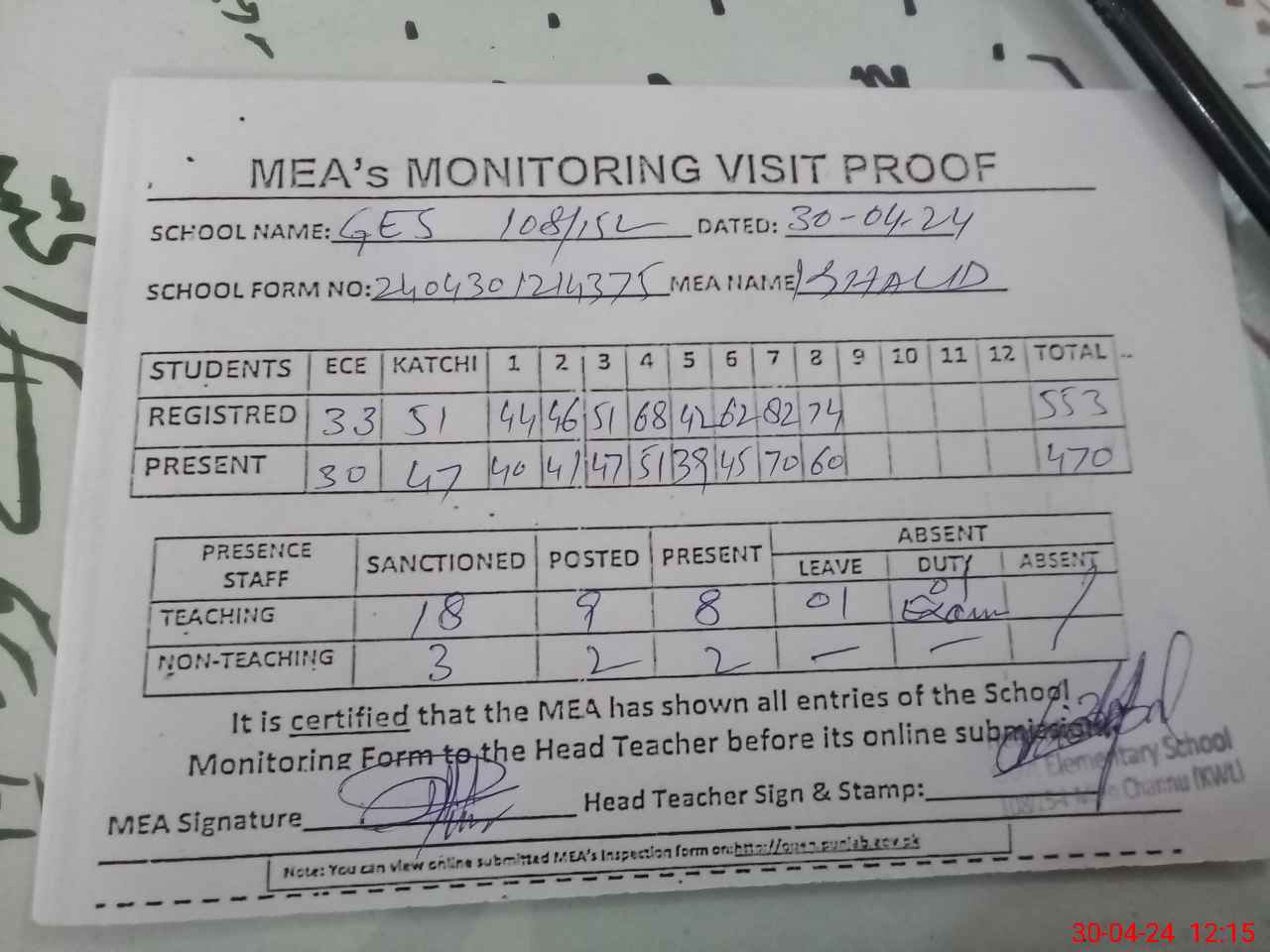 | EMIS Code: 36430050 | Name of School: GES 108/15-L, MIAN CHANNU | |||